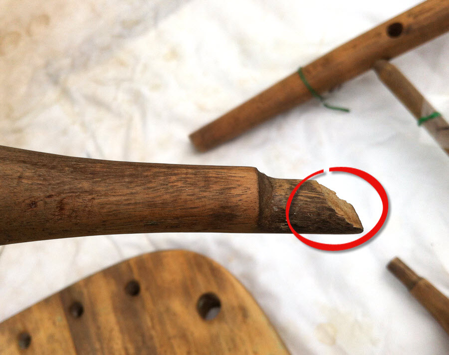 End of chair rung reshaped to fit into the hole that now had a bit of dowell running through it