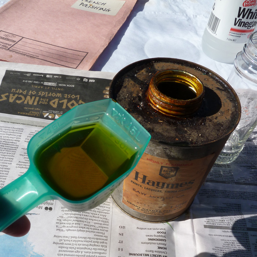 - Pour equal parts of vinegar, metho, linseed oil and turps into a jar